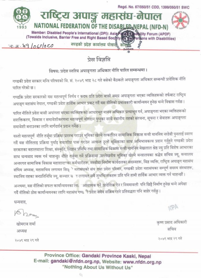 विज्ञप्तिमा राष्ट्रिय अपांग महासंघ नेपाल गण्डकी प्रदेश कार्यालय पोखराका अध्यक्ष खोमराज शर्मा र सचिव कृष्ण प्रसाद अधिकारीको धन्यबाद सहितको हस्ताक्षर रहेको छ ।