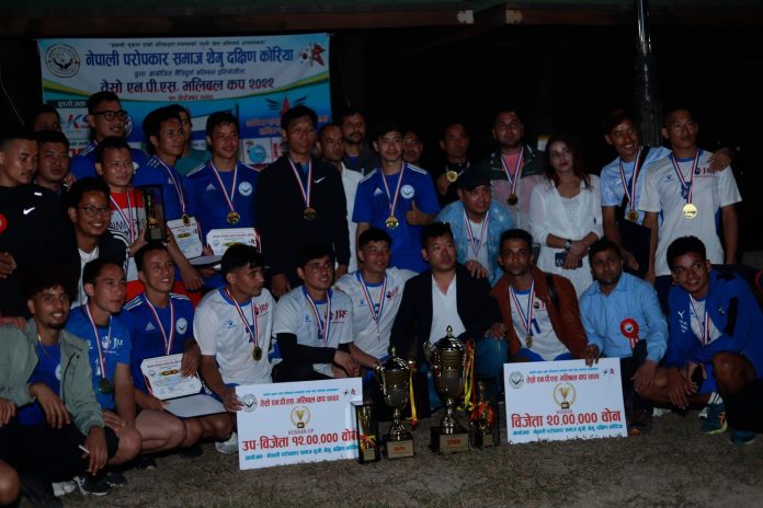 कोरिया स्थित नेपाली परोपकार समाजद्वारा आयोजित “तेश्रो एनपिएस कप भलिबल प्रतियोगिता २०२२” को उपाधी बागलुङ समाज दक्षिण कोरियाले आफ्नो पोल्टामा पारेको छ । थेगु सहरको गुजि खेलमैदानमा सम्पन्न भएको उक्त प्रतियोगिताको फाईनलमा नेपाली परोपकार समाज विरुद्ध सोझो सेट २३/२५ र २२/२५ मा अग्रता लिएको बागलुङले नगद २० लाख कोरियन वोन सहित आकर्षक ट्रफी, मेडल र प्रमाण पत्र प्राप्त गर्दै विजेता बनेको हो ।