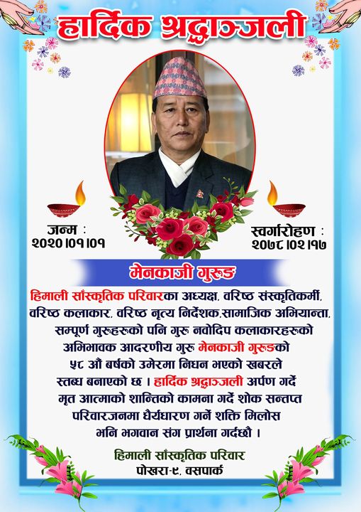 पोखरा । बरिष्ठ नृत्यकार, कलाकर्मी तथा संस्कृतिकर्मी हिमाली सांस्कृतिक परिवारका अध्यक्ष मेनकाजी गुरुङको असमयिक निधन भएको छ । उनको उपचार क्रममा फिस्टेल अस्पताल पोखरामा गएराति ५८ वर्षको असमायिक निधन भएको हो । ३ साता अघि नै काेराेना संक्रमणबाट मुक्त भए पनि उनमा मुटुको समस्या देखिएको थियो । मुटुमा समस्या देखिएपछि स्वर्गिय गुरुङलाई गत साता उपचारका लागि फिस्टेल अस्पतालमा भर्ना गरिएकोमा गएराति १ बजे निधन भएको परिवारजनले जनाएको छ ।