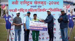 नवौं राष्ट्रिय खेलकुद प्रतियोगिता अन्तर्गत महिला क्रिकेटमा नेपाल सशस्त्र प्रहरी बल (एपीएफ) र सुदुर पश्चिम प्रदेश विजयी भएका छन् । मंगलबार पोखरा रंगशालामा भएको पहिलो खेलमा एपीएफले वागमती प्रदेशलाई ४ विकेटले पराजित गरेको थियो । वागमतीले पहिला व्याटिङ गर्नुका साथै पूरा २० ओभर खेल्दै ७ विकेटमा ८९ रन जोडेको हो । विजयीका लागि ९० रन पछ्याउने क्रममा एपीएफले १९.१ ओभरमा ६ विकेट गुमाएर विजयी गरेका हुन् । व्यटिङमा रोमा थापाले २२, ममता चौधरीले १७, सीता राना र नेरी थापाले समान १६ रन बनाउनुभएको थियो ।