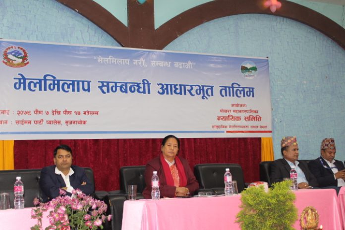 पोखरामा विहीबार देखि मेलमिलाप सम्बन्धी आधारभुत एक हपते तालिम सुरु भएको छ । पोखरा महानगरपालिका न्यायिक समितिको आयोजनामा भएको तालिमको उद्घाटन गर्नुहुँदै, नगरपालिका प्रमुख धनराज आचार्यले तालिमले मुद्धामामिला रहितमा टेवा मिल्ने विश्वास व्यक्त गर्नुभयो । उहाँले सानो कुरामा भएको झगडालाई स्थानिय तहमै मेलमिलापकर्ताहरुले मिलाउन सकिने समस्या समाधान हुने बताउनुभयो ।