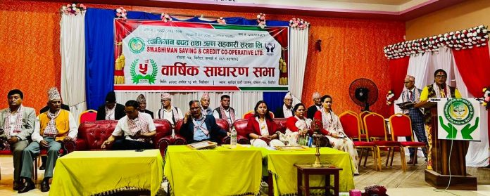 स्वाभिमान बचत तथा ऋण सहकारी संस्था लिमिटेडको ५ औ वार्षिक साधारण सभा सम्पन्न भएको छ । विहीबार पोखरामा भएको सभाको उद्घाटन गर्नुहुँदै पोखरा १७ की, अध्यक्ष राधिका योगीले सहकारीको सिद्धान्तलाई कार्यन्वयन गर्दै अघि वढे, उच्च स्थानमा रहन सकिने बताउनुभयो । साथै, शेयर सदस्यहरुले मुनाफा भन्दा पनि बचत र समय कति दिने भन्ने बारे ध्यान दिनुपर्नेबारे अध्यक्ष योगीले आग्रह गनुभयो । सहकारीलाई विधि र नितिमा रहेर काम गर्न पनि आग्रह गर्नुहुँदै उहाले, सकेको साथ र सहयोग दिने प्रतिवद्धता व्यक्त गर्नुभयो । जिल्ला वचत संघका अध्यक्ष भेषराज बरालले सहकारीलाई खाजा, भत्ताको रुपमा नहेर्न शेयर सदस्यहरुलाई आग्रह गर्नुहुँदै, सहकारीका बारे बुभ्mनुपर्नेमा जोड दिनुभयो । साथै बन्दसत्रमा गहनरुपमा छलफल गरी अघि वढ्नका लागि समेत उहाँले आग्रह गर्नुभयो । पछिल्लो समयमा अनुगमनको क्रममा केही डाक्टर, इन्जिनियर र सांसदहरुले सञ्चालन गर्दै आएको सहकारीहरु विग्रिएको पाइएको र जसलाई सुधार्नुपर्ने बताउनुभयो । कार्यक्रममा सहकारीकी सल्लाहकार तथा क्षेत्री समाज नेपाल महिला केन्द्रीय अध्यक्ष उर्मीला क्षेत्रीले शेयर सदस्यहरुको तर्फबाट, बन्धना कार्कीले सम्मानित हुनेहरुको तर्फबाट र भारतीय भूपू शैनिक गोर्खा विग्रेडका अध्यक्ष कर्नेल कृष्ण बहादुर खत्रीले सल्लाहकारको तर्फबाट शुभकामना मन्तव्य दिनुभएको थियो ।